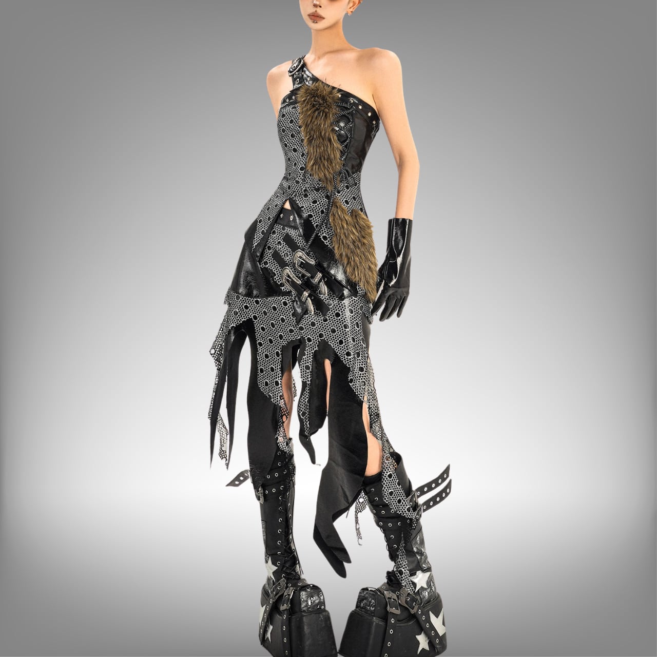 独特なコラージュを施したワンショルダーのトップスとミドル丈スカートのセットです