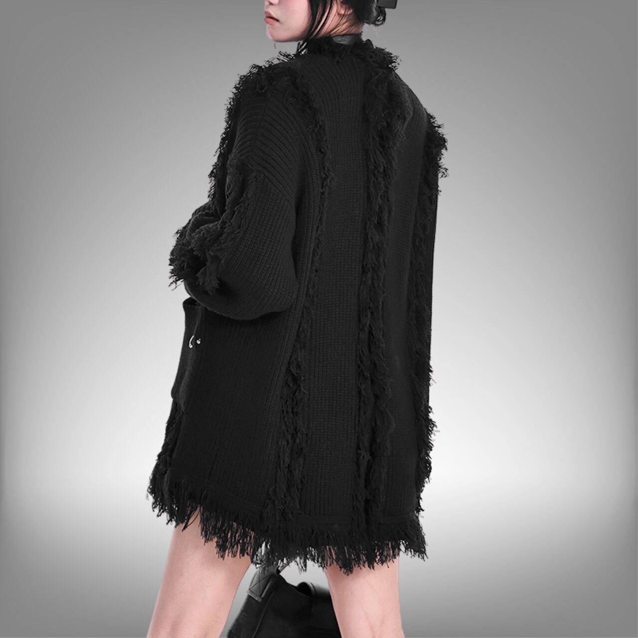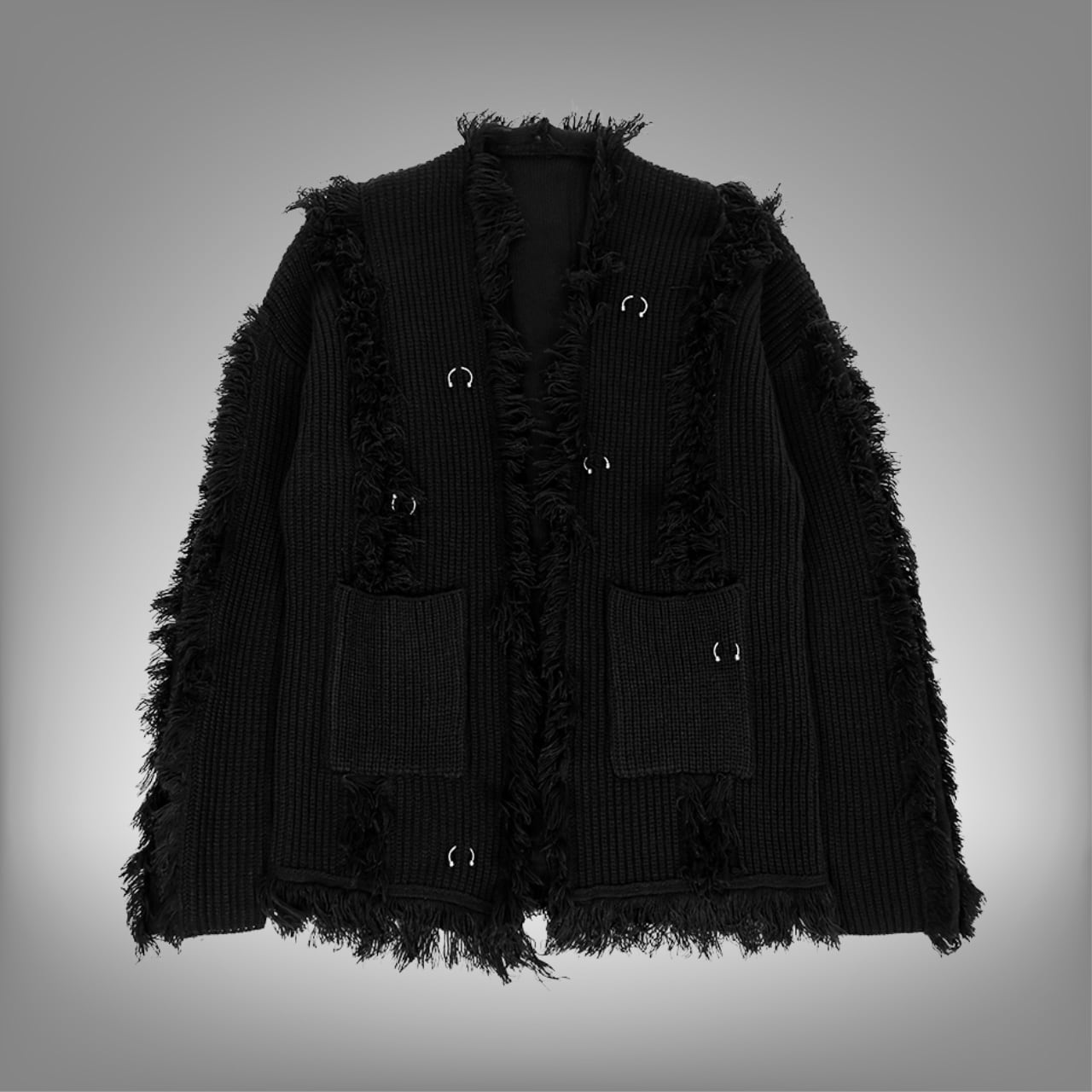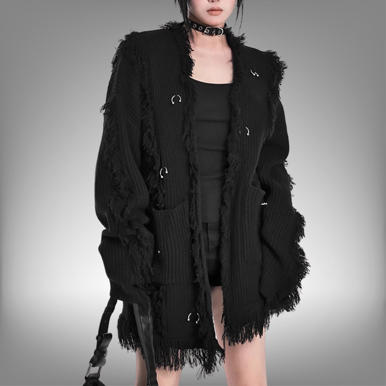 ほつれエッジが魅力のニットカーディガン。さりげないロック感を演出し、シルバーリングのワンポイントが全体を引き締めます。