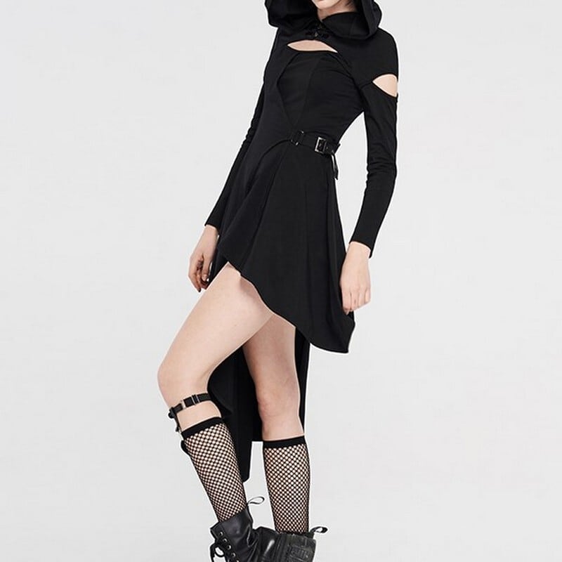 オシャレでカッコイイ、黒のフード付き アシンメトリーワンピースです。